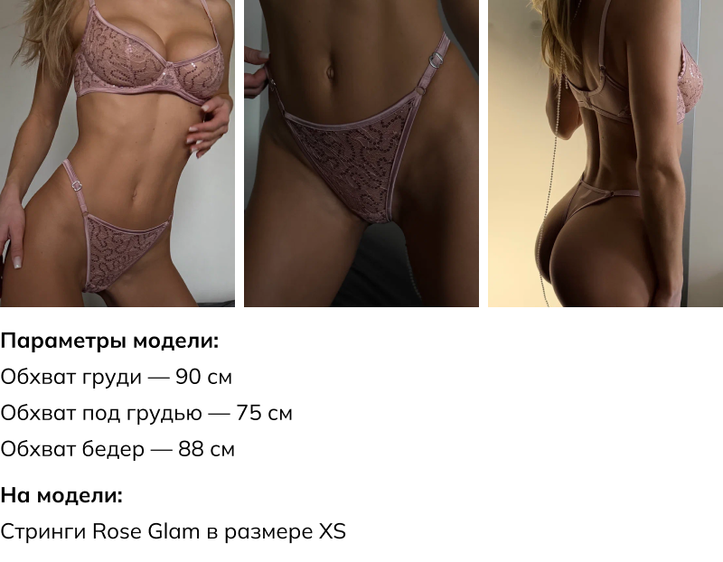 Миниатюрные стринги из нежного розового кружева с отделкой из сверкающих пайеток. Регуляторы на тонких атласных бретелях позволяют адаптировать модель под любую фигуру.