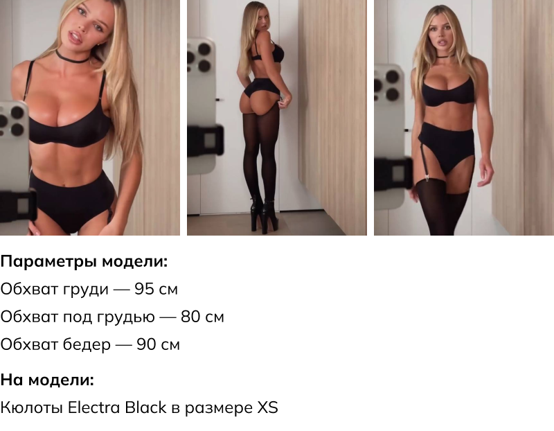 Высокая посадка вторит формам тела, а съемные подтяжки для чулок позволяют собрать комплект для особого случая. В комплекте с бра Electra Black у вас получится образ, где комфорт и соблазн дополняют друг друга.
