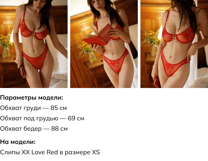 Прозрачная ткань манящего красного цвета, украшенная изящной цветочной вышивкой, придаёт модели лёгкость и романтичность. Завершающим акцентом выступает фурнитура в виде сердца на спинке.