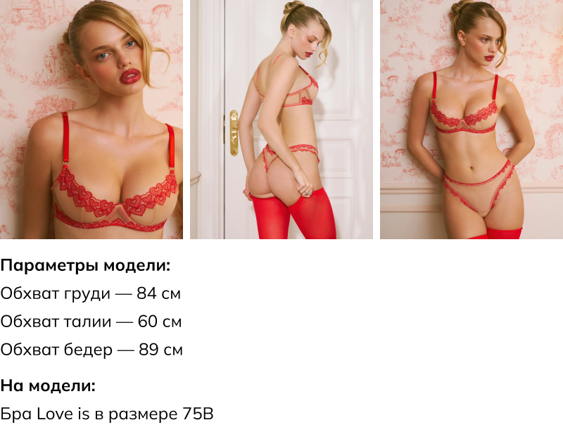 Игра чувств, застывшая в кружеве… Нежная прозрачная сеточка словно сливается с кожей, а изысканная вышивка в форме ажурных сердец подчёркивает романтичность момента.